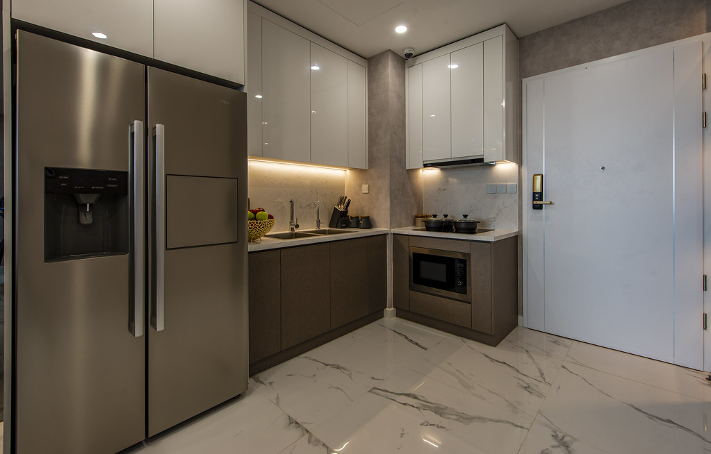 Khu vực phòng khách được lát sàn gỗ công nghiệp cao cấp chống ẩm, trần thạch cao giật cấp kết hợp hệ thống đèn LED âm trần hiện đại, tạo nên không gian ấm áp và tinh tế. Toàn bộ căn hộ sử dụng cửa kính Low-E khổ lớn, mang lại tầm nhìn rộng mở và khả năng cách âm, cách nhiệt tối ưu. Khu vực bếp được trang bị tủ bếp trên – dưới bằng gỗ MDF chống ẩm phủ acrylic, mặt bếp đá granite tự nhiên, đi kèm bếp từ, hút mùi và chậu rửa inox cao cấp.